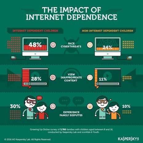 מחקר שערכה iconKids & youth עבור מעבדת קספרסק, חשף את ההשפעה שיש לתלות היתר באינטרנט על ילדים ברחבי העולם. 55% מהילדים הוגדרו כבעלי תלות באינטרנט וכבעלי סבירות כפולה להסתיר מהוריהם פעילות מסוכנת ברשת