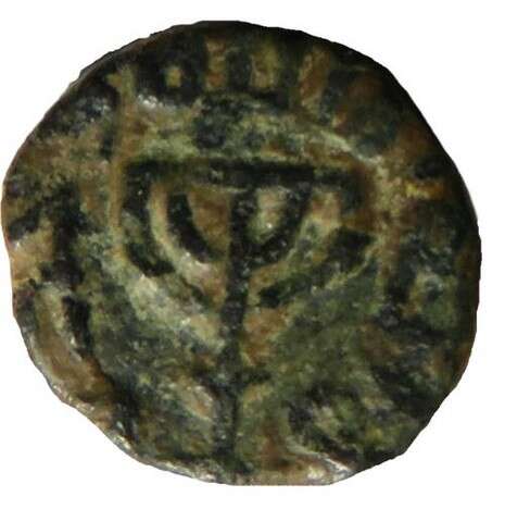 מטבע מוסלמי מברונזה מהתקופה האומיית עם מנורת שבעת הקנים