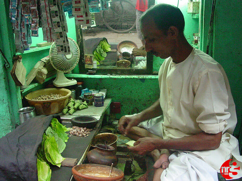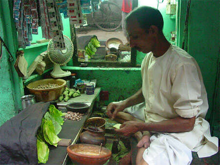 המוכר מגלגל עלים שבתוכם טבק לעיס. שימו לב ללוטוס הנונשלנטי.