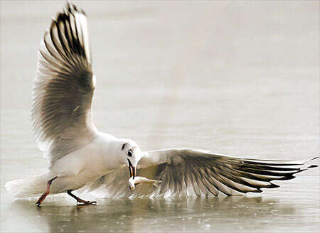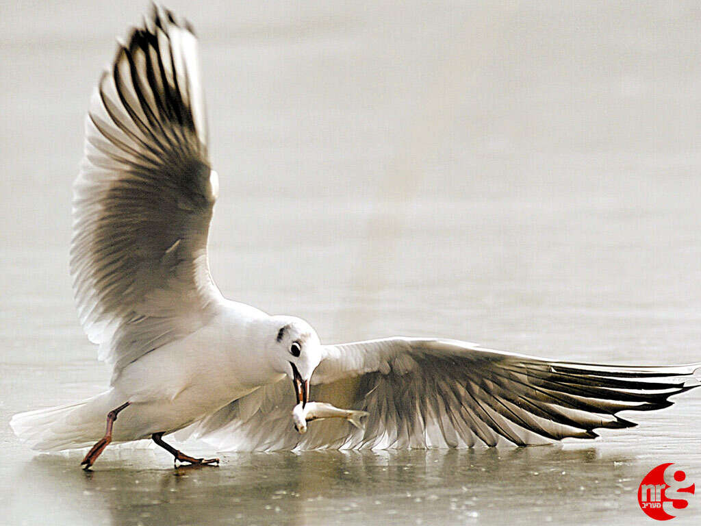 שחף נוגס בדג על מימיו הקפואים של אגם דוריאן שבמקדוניה