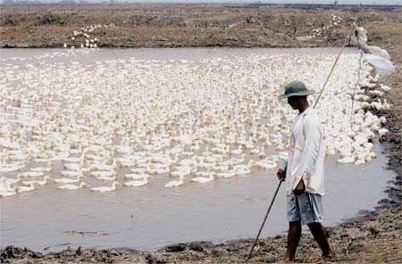 איכר תאילנדי משגיח על להקת ברווזים בשדה אורז סמוך לבנגקוק.