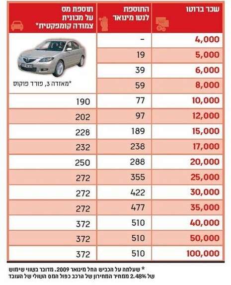 בעלי רכב צמוד ישלמו החל מינואר מס גבוה יותר עקב העלאת שווי השימוש. תוספת המס על השימוש ברכב צמוד תגיע ל-190 שקל בחודש למרוויחי 10,000 שקל ברוטו, 228 שקל ל-15 אלף ברוטו, 250 שקל בחודש למרוויחים 20 אלף ברוטו, 272 שקל ל-30 אלף ו-372 שקל ברוטו לכל המרוויחים למעלה מ-40 אלף שקל למכונית קומפקטית.