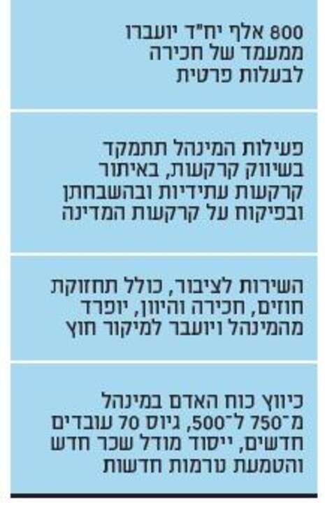 93 מקרקעות המדינה, וביצוע ארגון מחדש יסודי. מדובר בשינוי מבני וארגוני מקיף במינהל, שבמסגרתו יופרד השירות לציבור - הכולל חכירה והיוון - ויועבר למיקור חוץ. פעילות המינהל תתמקד בניהול מדיניות, בשיווק קרקעות, באיתור קרקעות עתידיות ובהשבחתן וכן בפיקוח על קרקעות המדינה.
