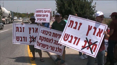 עשרות מפגינים יצאו לצומת מחניים בצפון וצומת סעד בדרום למחות כנגד "הפתרון החפוז של נתניהו למחאת הקוטג'" - הורדת התשלום אותו יקבלו על החלב; "הצרכנים חייבים להבין שבסוף מי שירוויח מהסיפור הזה אלו הם הטייקונים ויבואני החלב"