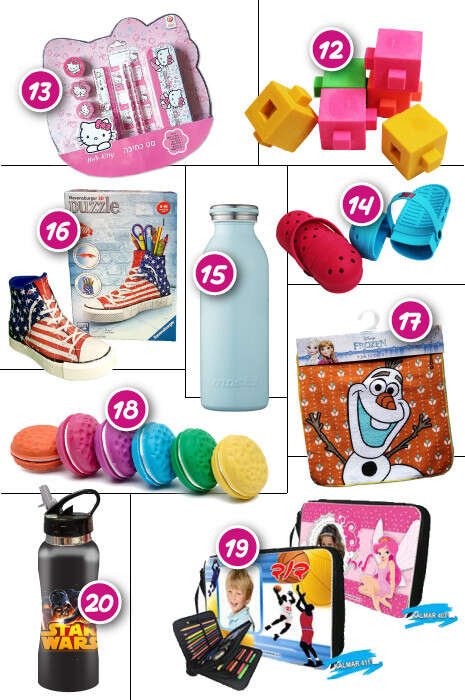 12. סט מחקים של עידן 2000, מחיר 12 שקל; 13. ערכת קלמר של פלפוט, 49 שקל; 14. קלמר של ביג שופ, 32 שקל; 15. בקבוק תרמי של shoppu – דברים יפים מיפן, 129 שקל; 16. מתקן לכלי כתיבה של פאזלנד, 149.90 שקל; 17. מפיות אוכל פרוזן של פלפוט, 29.90 שקל; 18. מחקים מקארון של YOLO, מחיר 14.90 שקל; 19. קלמר אישי של ביג דיל, 48 שקל; 20. בקבוק מלחמת הכוכבים של דיסני, 49 שקל.