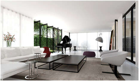 רצפת הטרצו של הבית נעשתה כיציקה בהירה המשלימה את האקלקטיות ואת הקו הנקי בעיצוב החלל. החלל הציבורי לאירוח כולל את שולחן הקרטייה וכן פסנתר כנף לפי דרישת הלקוחות. החלל מוקף מכל ארבעת צדדיו בפתיחות אל הרחוב, החצר והפטיו שבמרכזו של הבית, וכך מאפשר לחלל לפרוץ מעבר לקווי הבית ולהכיל את הסביבה שלו. ריהוט הסלון הינו של חברת B&B Italia.