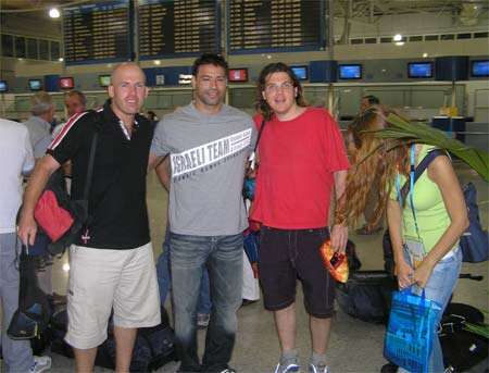 עמית לוינטל, מימין, ומארק, משמאל, ביחד עם אריק זאבי, אחרי הזכייה ההיסטורית במדליה באתונה, כמה רגעים לפני העלייה למטוס