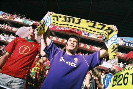 צביקה בן-יעקב מציג בגאווה צעיף של מכבי נתניה באיצטדיון לוז בליסבון, בגמר היורו בין פורטוגל ליוון