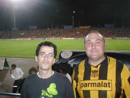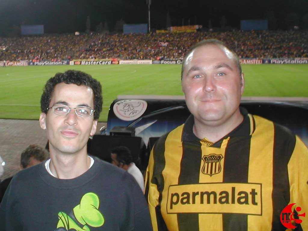 שחורי וגרגוריו על רקע אצטדיון ר'ג, רגע לפני הניצחון הגדול של מכבי ת'א מול אייאקס
