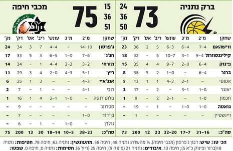 שלשה של ריץ' שברה את השוויון והעלתה את חיפה ליתרון שלוש (3 דקות לסיום). חג'ג עם סל קליל מתחת לסל העלה את חיפה ליתרון 63:69. נתניה הצליחה לצמצם, אבל חג'ג מהקו הבטיח את הניצחון של האורחים - 73:75.