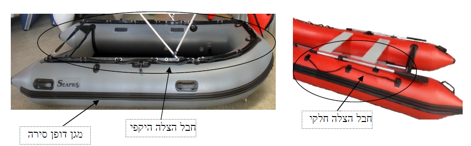 - חבל הצלה היקפי - חבל המקיף את הסירה ומשמש להצלה במקרה חירום. ניתן למצוא סירות עם חבל הצלה היקפי מלא, כולל טבעות מתכת מאסיביות או סירות עם חבל הצלה חלקי ללא טבעות. (לבחירה בהתאם לתקציב)