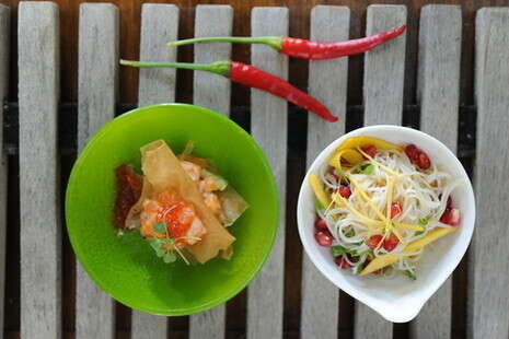 המנה הזו מבוססת על מרבד של טקסטורות שונות - הסלמון הרך, הפילו הפריך וביצי הסלמון המתפצפצות. סוד: את ביצי הסלמון כדאי לשטוף לפחות שלוש פעמים ולסנן, אחרת הן נורא מלוחות. הן יכולות להישמר בגרסתן הנקייה כשבוע במקרר.