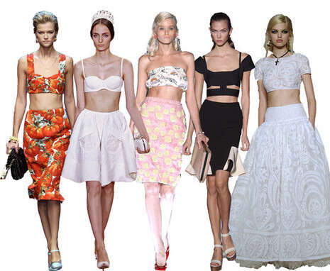 בין בתי האופנה ששילבו את הטרנד בקולקציה שלהם תמצאו את "פראדה" בגרסה שכוללת רצועת סטרפלס וחצאית עיפרון גבוהה; את "פוצ'י", הראשונים שהציגו את הטרנד בגרסתו הנוכחית על גווינת פאלטרו; את "מיו מיו" בגרסה מתוקה שראינו לאחרונה על רוני מארה; את "נינה ריצ'י" עם חזייה וחצאית A; ואת רולנד מורה בגרסה ספורטיבית.