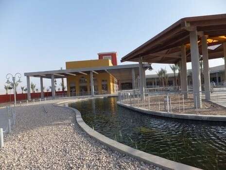 השער מגמד את הנכנס דרכו, המקום כולו מוקף חומה שנדמית כמבנה בוץ. צבעי המדבר משתקפים בגדר. הנוסע נלכד במבנה בגובה ובצבעוניות, ומחפש אחר מקום החניה בצל עצי התמר הענקיים.