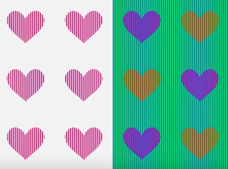 "הלבבות שמוקפים בפסים כחולים, נראים סגולים - ואילו הלבבות שמוקפים בפסים ירוקים, נראים כתומים", נאמר עוד בסרטון. כשמסירים את הפסים, לעומת זאת, מתברר שצבעם של הלבבות הוא זהה - ורוד.