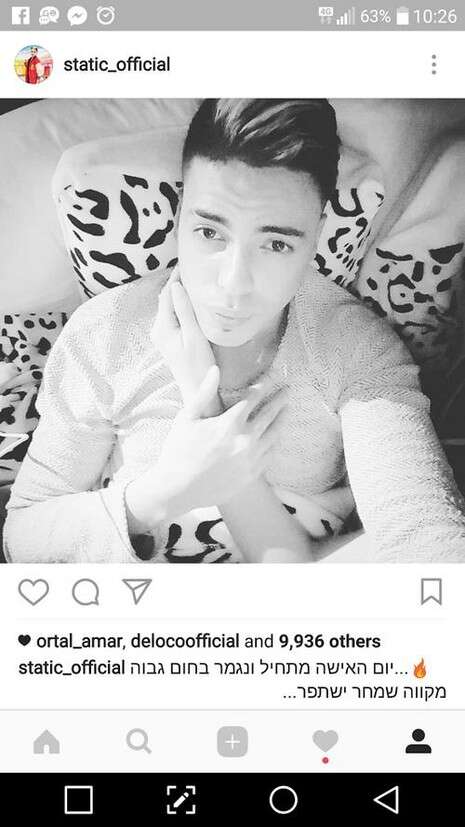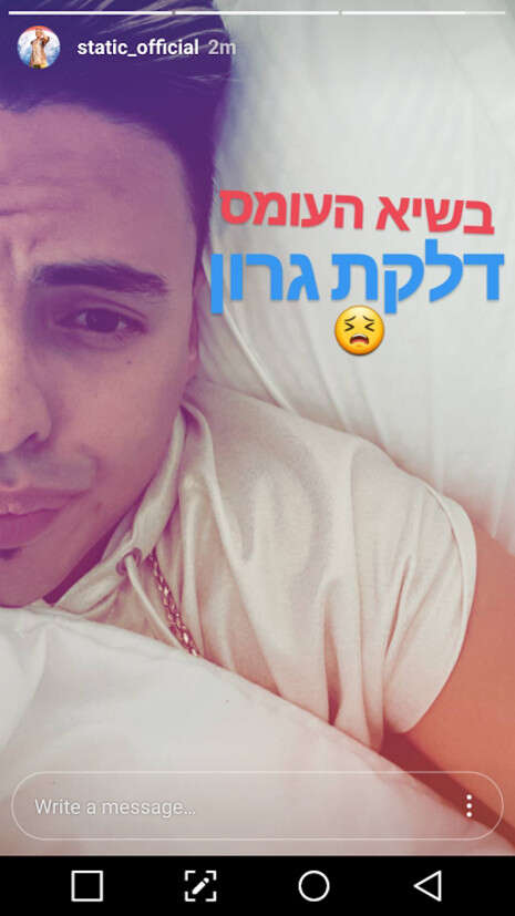 סטטיק (לירז רוסו, בשבילכם) העלה היום בצהריים (שני) תמונת סלפי שלו מהמיטה, שבה הוא נראה חולה וסובל. הסיבה: דלקת גרון שפקדה אותו "בשיא העומס", לטענתו. בניגוד לפעם הקודמת שבה דיווח על מחלה שפקדה אותו, העדיף סטטיק לא לצלם את עצמו ליד בחורה אנונימית שתגרום לשמועות ורעשים ברשת החברתית.