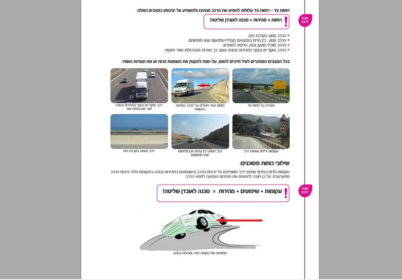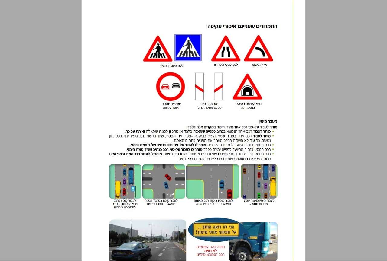 תמונות ואיורים נוספים נלקחו מ"ספר השאלות והתשובות למבחן הנהיגה העיוני בהוצאת משרד התחבורה והבטיחות בדרכים".