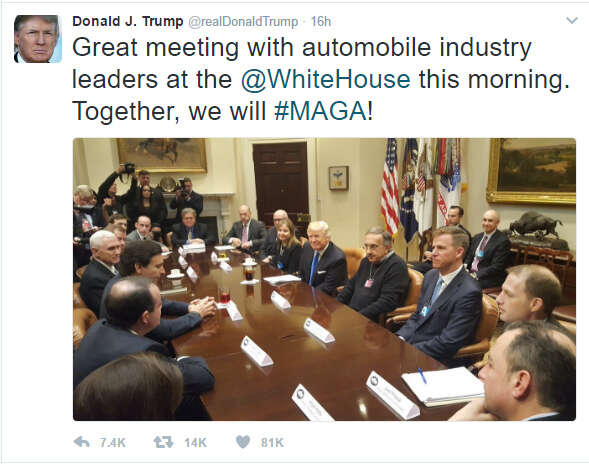 סרג'יו מרקיונה, מנכ"ל קונצרן פיאט האיטלקי שהשתלט על קרייזלר בעקבות המשבר הכלכלי הגדול של 2008 אמר לכתבים לאחר הפגישה כי הוא מעריך את ההתמקדות של הנשיא במטרה להפוך את ארצות הברית שוב למקום בו נהדר וקל לעשות עסקים. "אנו בקונצרן FCA נשמח לעבוד עם הנשיא ואנשיו כדי לחזק את הייצור המקומי".