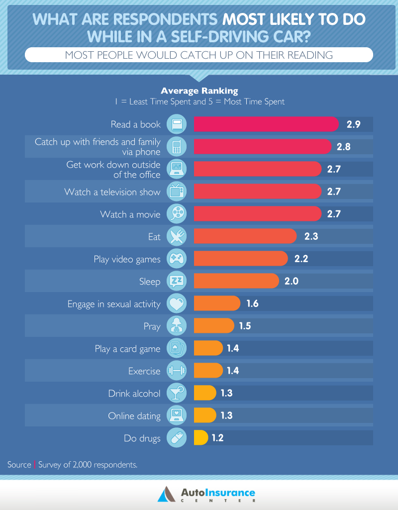 מכל מקום, הפעילות שזכתה לדרוג הגבוה ביותר מבין 15 פעילויות מאחורי ה"אין הגה" של מכונית אוטונומית, שאותה מדמיין לעצמו המספר הגדול ביותר של משיבים, בכל העולם, היא פשוט לקרוא ספר.