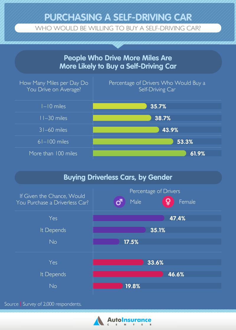 עוד עובדה לא מפתיעה היא שככל שנהגים מבלים יותר זמן בנהיגה כך הם מעדיפים למסור את השליטה למחשב: רק 35.7% מבין מי שנוהגים פחות מ-16 ק"מ ביום מעידים על עצמם שיעברו למכונית אוטונומית בסבירות גבוהה לעומת כמעט 62% מבין מי שנוהגים יותר מ-160 ק"מ ביום.
