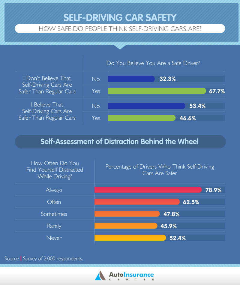 כך, למשל, כמעט 79% ממי שמעידים על עצמם שהם תמיד מוצאים את דעתם מוסחת בעת נהיגה סבורים שמכונית אוטונומית תהיה בטוחה ממכונית נהוגה בידי נהג, לעומת כמעט 46% מן הנהגים שמעידים על עצמם שדעתם מוסחת מן הנהיגה רק לעיתים רחוקות.