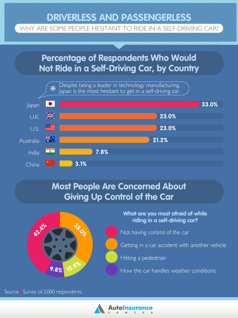 באופן מפתיע, האומה שהכי פחות מרגישה בנוח עם רעיון המכונית האוטונומית היא דווקא יפן -מדינה מובילה באהבה שלה לרובוטים בפרט ולחדשנות בכלל ומובילה עולמית בטכנולוגיה. 33% מן הנשאלים בארץ השמש העולה אומרים שהם פשוט לא מתכוונים לנסוע במכונית ללא נהג, וזאת, למשל, יחסית ל-7.8% מן הנשאלים ההודים.