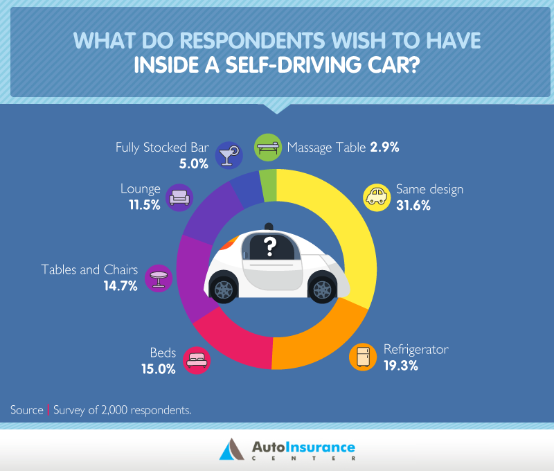 דווקא כאן התשובה הנפוצה ביותר קצת מאכזבת: 31.6% מן הנשאלים לא היו רוצים שינוי במכונית העתידית יחסית לזו המוכרת להם, 19.3 אחוז מהמשיבים מפנטזים על מקרר, 15% רוצים מיטות, 14.7% מבקשים בדמיונם שולחנות וכסאות, 11.5% רוצים ספות הסבה, 5% רוצים "בר מצויד היטב" ו-2.9 אחוזים היו רוצים מיטת מסאז'.