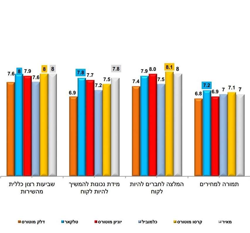 מתוך הנתונים שנמסרו ל-TheCar עולה שרמת שביעות הרצון הכוללת הגבוהה ביותר (8) הינה בקרב לקוחותיהם של טלקאר (קיה), קרסו מוטורס (רנו וניסאן) ומאיר (וולוו והונדה). יוניון מוטורס (טויוטה) קיבלה ציון של 7.9 ואילו כלמוביל ודלק מוטורס קיבלו ציון של 7.6.