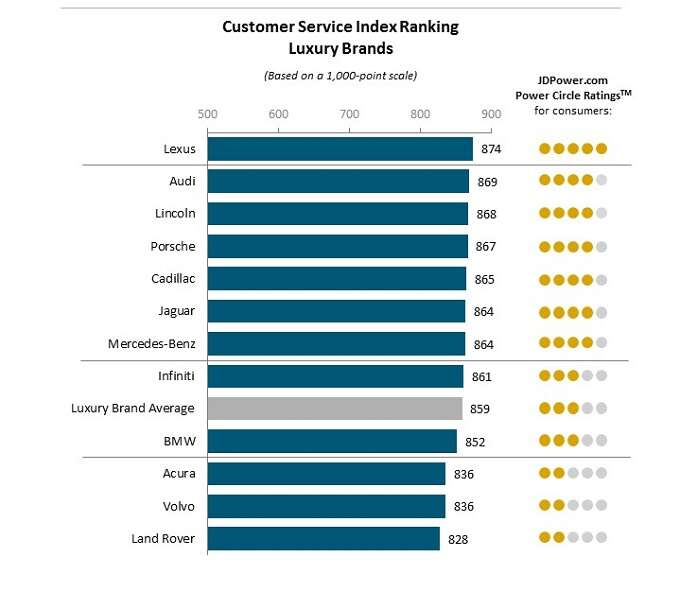 ניתוח של כל התוצאות בחלוקה מותגית מגלה שבקרב לקוחות של מותגי יוקרה זוכה רשת השירות של לקסוס לדירוג הגבוה ביותר עם ציון של 8.74 ובעקבותיה צועדים אאודי (8.69); לינקולן (8.68); פורשה (8.67); וקאדילק (8.65). בשוק העממי מדורגת ביואיק עם הציון הגבוה ביותר בשביעות הרצון עם ציון של 8.60 ובעקבותיה מדורגות (8.50) GMC מיני (8.37); שברולט (8.29); וניסאן (8.22).