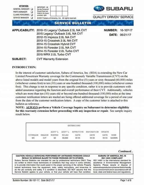 בסובארו לא מייחסים את הארכת האחריות לבעיה ספציפית (למרות שעל פי דיווחים שונים מדובר בבעיה בממיר המומנט של התיבה), וכך כתבו בהודעת השירות שלהם: "הרחבת אחריות (על תיבות הילוכים) CVT לטובת שביעות רצון הלקוחות. סובארו של אמריקה מרחיבה את... האחריות לרכב חדש... על תיבת ההילוכים הרציפה בדגמים שמפורטים לעיל מן האחריות המקורית של חמש שנים או שישים אלף מייל (המוקדם מביניהם) עד לעשר (10) שנים או מאה אלף (100,000) מייל (המוקדם מביניהם).