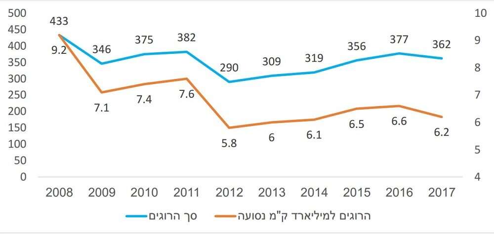 ראשית לכל -מספר ההרוגים בערי ישראל זינק ב-20%, ושנת 2018 מסתכמת כאחת השנים הקטלניות ביותר בתחום העירוני עם לפחות 152 הרוגים, לעומת 127 בשנה שעברה. מספר ההרוגים הכללי, שאינו סופי כאמור, ירד אמנם ב-15, אולם למעט השנה שעברה, שהייתה קטלנית במיוחד, שנת 2017 היא השנה הקטלנית ביותר על כבישי ישראל מאז שנת 2011.