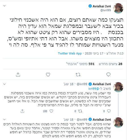 "כתוב בספרים של המקובלים – אישה שהייתה רגילה לחשוף את החלק העליון שלה, בדרך כלל מחזירים אותה בגלגול של פרה. זאת גם אחת הסיבות שנשים סובלות מסרטן השד. העיניים של כולם שם ונהיה להן עין הרע" pic.twitter.com/7JgdU9hHJF— יובל שגב | Yuval Segev (@Segev_Yuval) June 16, 2020