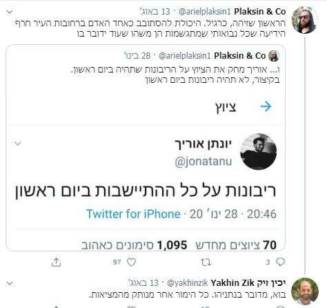 זהו. וככה זה היה מרוח על פני אלפי ציוצים נזעמים. זה נותן את השנקל שלו, וזה את הארבע דרכמות שלו על הנושא. זה כותב "דעה לא פופולארית" למרות שאלפים כתבו אותה לפניו, וזה עונה לו ב"דעה מאוד פופולרית" כי גם את הדעה הזו כתבו כבר לפניו. בקיצור, יש לכם מזל שאני פה ומוכן לבזבז את הזמן שלי בשבילכם כדי שתוכלו לבזבז את הזמן שלכם ברשתות חברתיות אחרות (בואו, זה לא שמצאתם תרופה לקורונה, בזמן שחסכתי לכם).