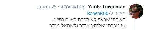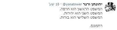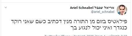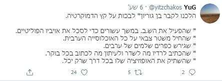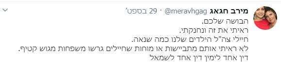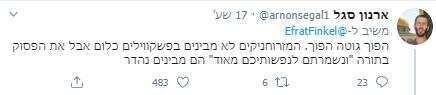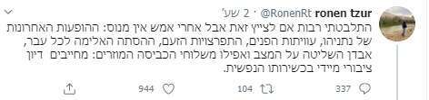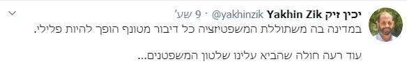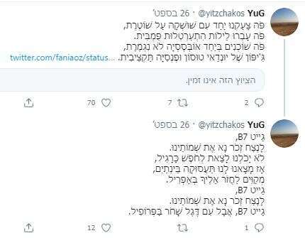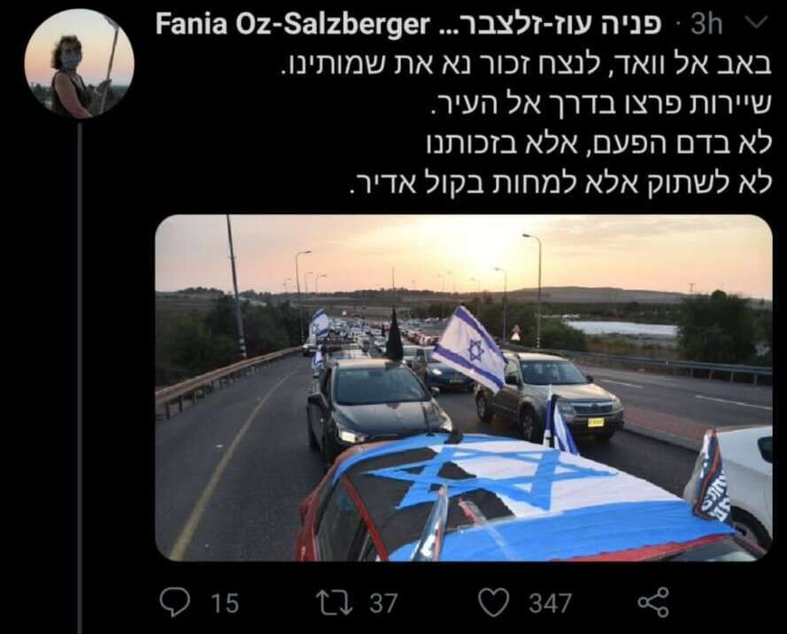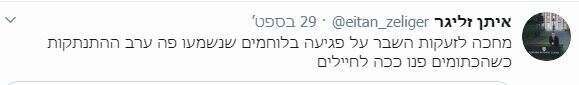 הנה לדוגמה ציוץ של פניה עוז זלצברגר (שנמחק מאוחר יותר), שהיא גם הבת של הסופר עמוס עוז ז"ל: