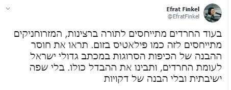 מי שעלתה על כולם, היא הצייצנים החרדית והעיתונאית אפרת פינקל שהחליטה לרדד את השיח עד לגובה של מזרן פילאטיס בטענה שאנחנו פשוט לא מבינים את הדקויות של גדולי ישראל וההנחיות שלהם לציבור שומעיהם: