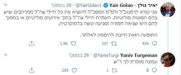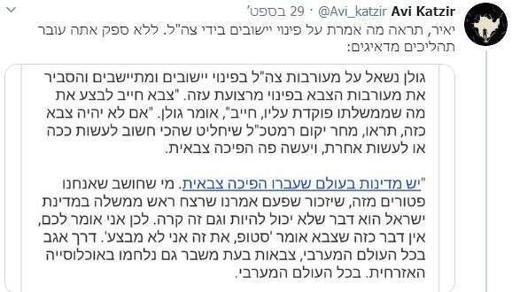 הנה למשל, דובר צה"ל ומפקד גלי צה"ל לשעבר אבי בניהו. תא"ל במיל' שמצייץ את הציוץ הבא:
