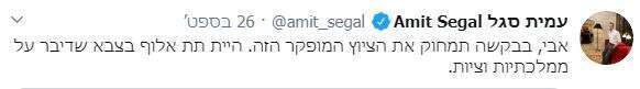 הציוץ הזה הביא גם את עמית סגל יחד עם עוד רבים נוספים לא לעודד את מסיבת הקורונה בצמתים לטובת איזו "מלחמת שחרור".