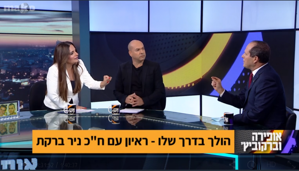 ברקוביץ' בשלב זה ביקש לתקן את אופירה: המתח הוא לא בין הליכוד לתוכנית, אלא בין רק חלק מחברי הליכוד, אותה להקת מעודדות, לדבריו. עם כל הכבוד לאבחנה, תרשו לי להתעכב דווקא על החלק שבו מודגשת "התוכנית". התוכנית כמוקד העניין, התוכנית כצד שווה במשוואה. המגמה בה התקשורת מסקרת עצמה לדעת איננה חדשה, אבל אצל אופירה וברקו היא שוברת שיאים. בעולמם, הם לא רק הצד המסקר, הם הסיפור. לב העניין. ולכן, כשמירי רגב מאיימת על ברקו בשפת ביבים, זה בבחינת אייל גולן מסיר עוקב מאופירה. עוד אייטם ששודר בתוכנית שלהם, בו אופירה הייתה לא רק המראיינת, אלא חלק מהסיפור עצמו.