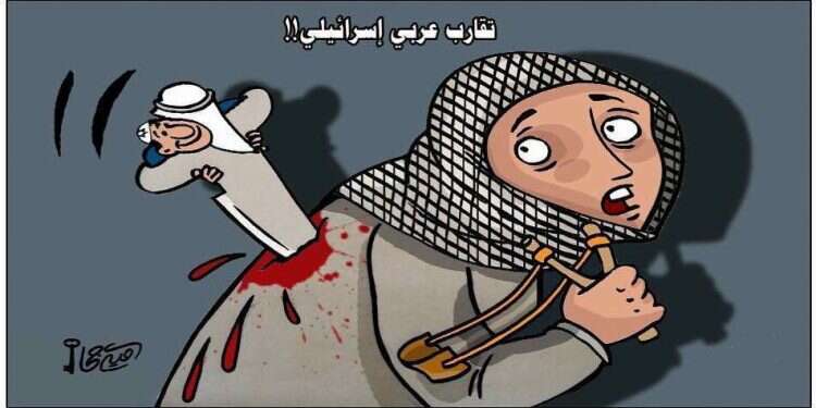 בקריקטורה עצמה אפשר להבחין באישה הפלסטינית מחזיקה מקלע בידה, אך החיבוק הערבי(סעודי)-ישראלי נעוץ לה בגב כסכין. בקריקטורה עצמה כתוב: "התקרבות ערבית יהודית".
