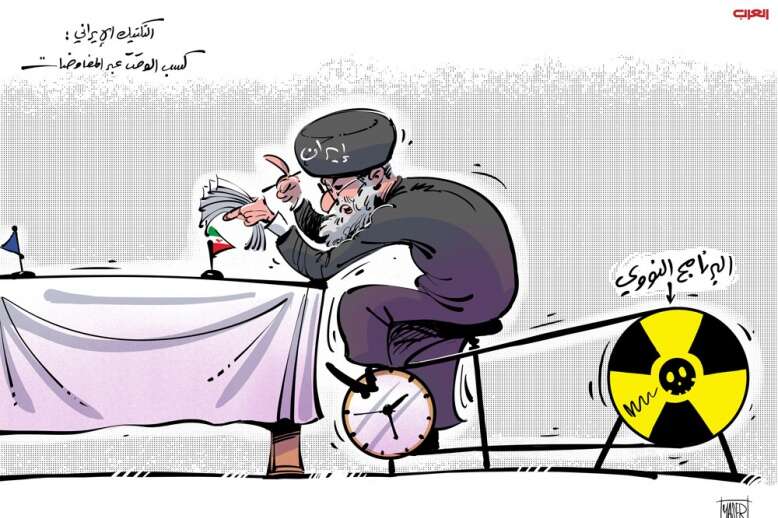 כותרת הקריקטורה – "הטקטיקה האיראנית: להרוויח זמן באמצעות משא ומתן" – א-תַכְּתִיכּ אלאִירַאנִי: כַּסְבּ אלוַקְת עַבְּרַ אלמֻפַאוַדַאת.