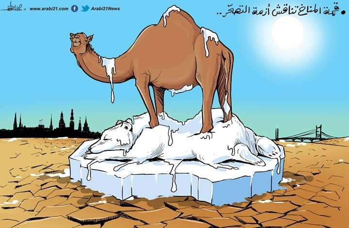 הכותרת: פסגת האקלים תדון במשבר המידבור- قمة المناخ تناقش أزمة التصحر – קִמַת אלמֻנַאח' תֻנַאקִש אַזְמַת א-תַצַחֻר. אחת הבעיות הנובעות משינוי האקלים ועלייה במידות החום היא הפיכת איזורים יבשים לצחיחים לחלוטין ולהתפשטות המדבר.