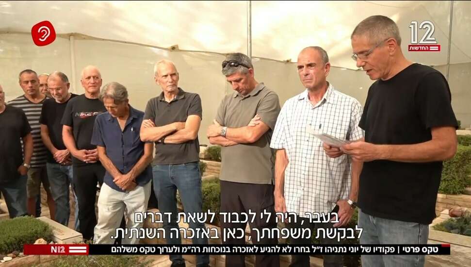 נעבור לשבוע האחרון. ביום חמישי שודרה במהדורה המרכזית של ערוץ 12 כתבה אוהדת על חבריו של יוני נתניהו ז"ל. כבר 48 שנים הם מגיעים לאזכרה השנתית, מדווחת יולן כהן, אבל "הפעם הם בחרו להתייחד עם זכרו של המפקד הנערץ באופן פרטי, וללא נוכחות משפחת נתניהו". פרטי מאוד, כל כך פרטי עד שהם הזמינו תקשורת.