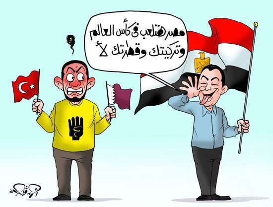 אחמד קאעוד מהעיתון אל-יום א-סאבע המצרי מנצל את פתיחת גביע העולם כדי ללעוג ליריבות של מצרים שלא עלו. האיש חורץ הלשון והמחזיק את דגל מצרים אומר "מצרים משחקת בגביע העולמי - טורקיה שלך וקטאר שלך לא משחקות". האיש הכועס והמחזיק את דגלי קטאר וטורקיה לובש חולצה צהובה עם סמל ה"רָאבִּעַה". ה"רָאבִּעַה" מסמל את הטבח של הגנרל א-סיסי באנשי האחים המוסלמים ב-14 באוגוסט 2013, בכיכר "רָאבִּעַה אלעַדַוִיַה".