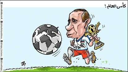 בקריקטורה של עמאד חג'אג' הירדני שכותרתה 'גביע העולם' אפשר לראות את הנשיא הרוסי משחק בכדורגל שהוא בעצם הגלובוס (שימו לב כי במרכז רואים את יבשת אפריקה ומעליה את אירופה ואסיה). פוטין בבגדי שופט כדורגל כשדגל רוסיה על חולצתו מחזיק בגביע העולם עליו כתוב - סוריה, המקום עליו הוא שולט.