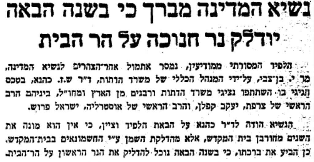 בחמשת העשורים מאז מלחמת ששת הימים (יוני 1967) נעשו ניסיונות עקרים להדלקת חנוכיות בהר הבית, אך עד לכתיבת שורות אלו, לא חל שינוי בהחלטת ממשלת ישראל ולא נותר אלא להסתפק בברכתו של נשיא המדינה בן־צבי "כי בשנה הבאה יודלק נר חנוכה על הר הבית".