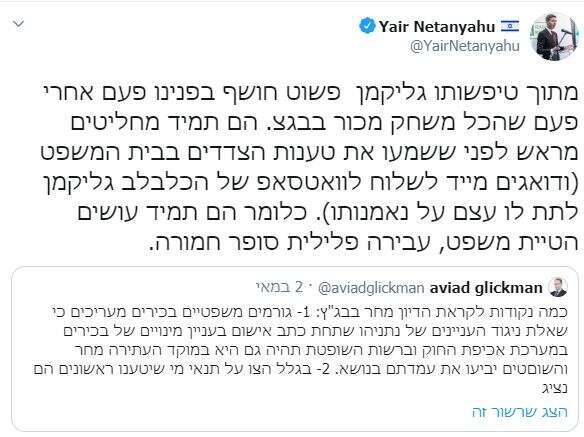 בנו של ראש הממשלה עסק בעיקר בהערכה המלומדת של הכתב המשפטי של ערוץ 13, אביעד גליקמן, ובנה עליה תילי תילים של קונספירציות. במבט לאחור גם גליקמן טעה וגם נתניהו הוכיח את המשפט בהיפוך קל - זה שרודפים אחריך לא אומר שאתה לא פרנואיד: