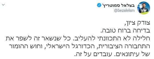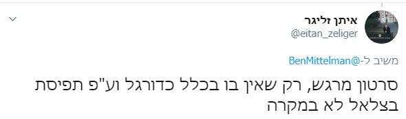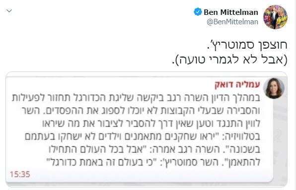 הדוגמה השלישית התחילה ממשהו כל כך אזוטרי, שגם מי שבקי באופן שבו טוויטר יכול להפוך יתוש לפיל עמד נדהם מול התופעה. זה התחיל מדיווח צדדי בהחלט על בדיחה קלילה על הכדורגל הישראלי שסיפר בצלאל סמוטריץ' בתגובה לבקשה של שרת התרבות והספורט, מירי רגב לחדש את משחקי הכדורגל: