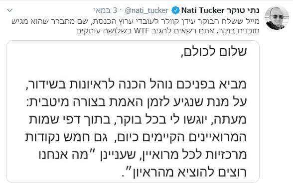 הדוגמא השנייה היא כתב התקשורת של דה מרקר, נתי טוקר שנורא התרגש שמייל פנימי עם הוראות עריכה של עידן קוולר הגיע אליו ומיהר לפרסם ולגחך.