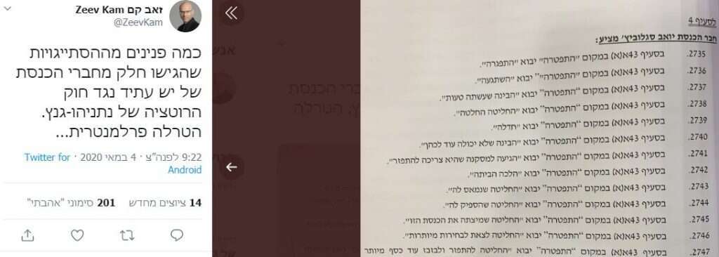 בציוץ קצר הסביר הכתב הפוליטי של תאגיד השידור הציבורי מהן רמת ההסתייגויות עליהן הצביעו במשך כל הלילה, ודחו אחת לאחת בהליך מהיר (במקרה הזה אלו הסתייגויות של ח"כ סגלוביץ' אבל הרמה של אלו של ח"כ לוי לא הייתה גבוהה יותר: