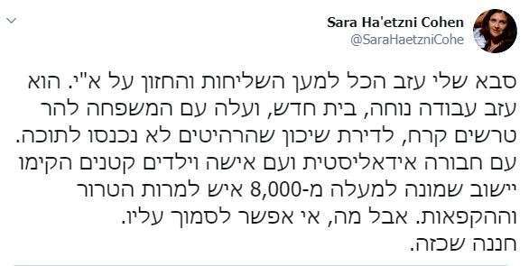 שרה העצני, יו"ר "ישראל שלי" ונכדתו של אליקים העצני, מייסדי התנועה למען ארץ ישראל השלמה וממקימי מקרית ארבע: